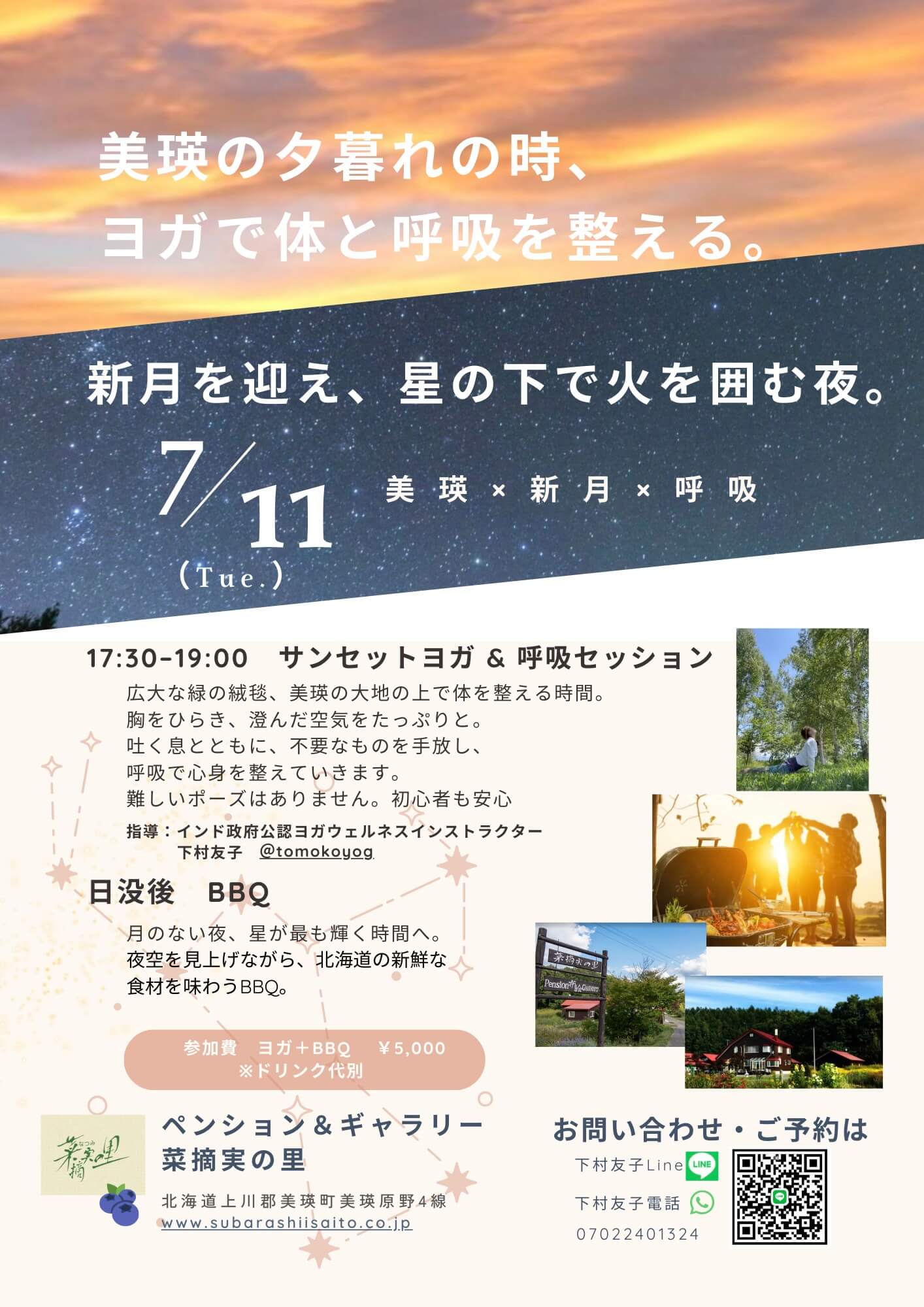 7/11は、サンセットヨガと呼吸セッションを行います。日没後にはBBQも!